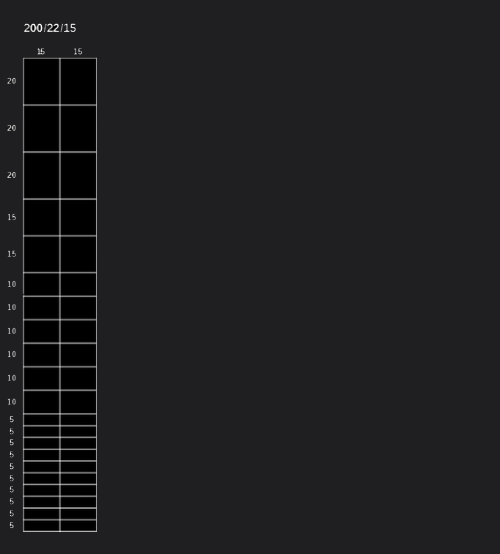 Verkon alalaidassa koko on 5x15 cm, jonka jälkeen se kasvaa 10x15 cm kokoiseksi, ja suurimmat aukot ovat 15x15 cm ja 20x20 cm kokoisia verkon ylälaidassa.